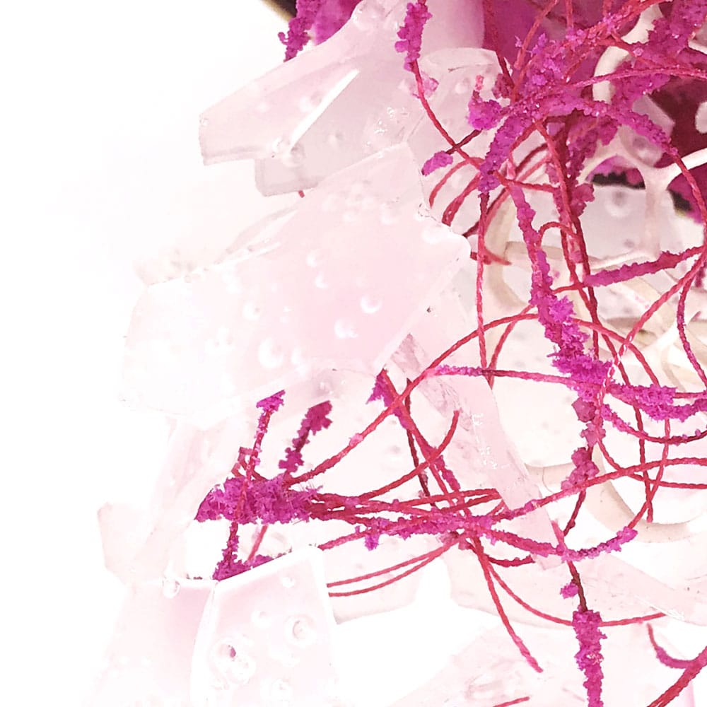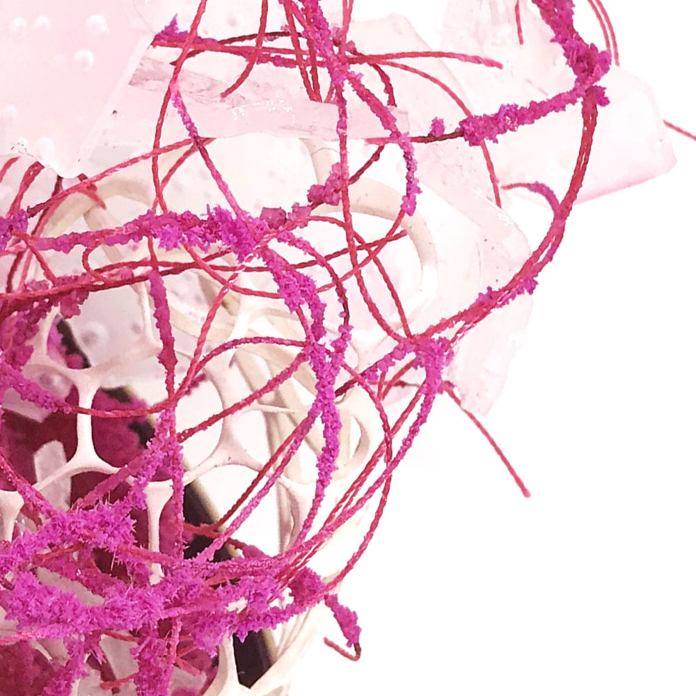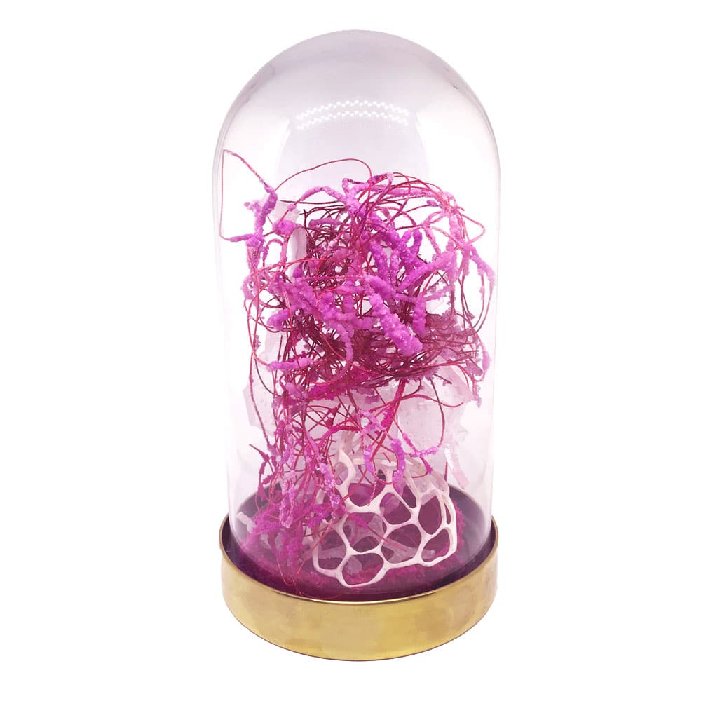 Cristalizaciones de sal, hilo y formas orgánicas cortadas mediante láser en metacrilato y goma eva. Micro Mundo encapsulado en urna de vidrio con base dorada.